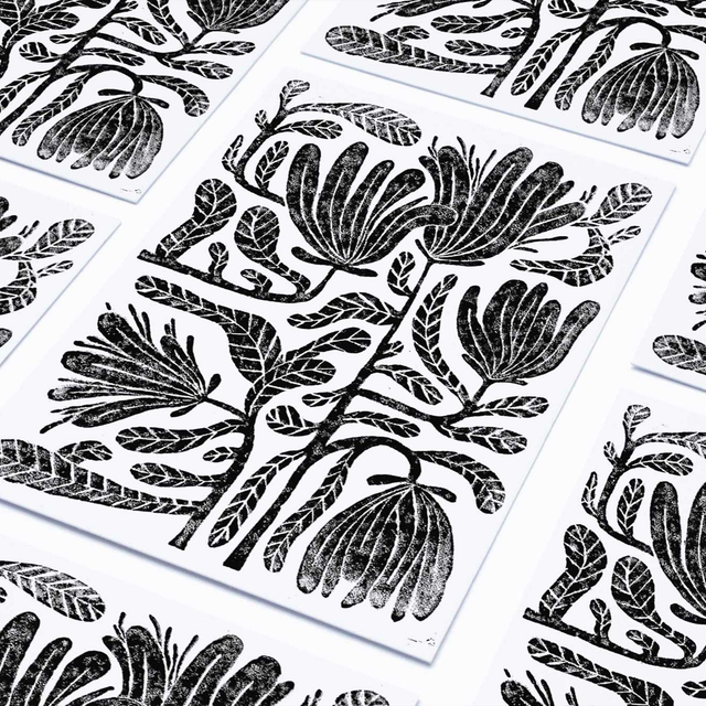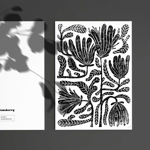 La linogravure, ou le travail de gravure sur linoleum, consiste à la création d'une plaque imprimable de manière artisanale, feuilles après feuilles, dans laquelle les vides du motif illustré viennent révéler le résultat final. Une encre noire, épaisse et pâteuse, spécialement utilisé dans ce cadre, se pose sur les parties en relief non retirées. Après pression du papier 250g sur la plaque, l'empreinte de l'encre se transfert sur ce dernier.