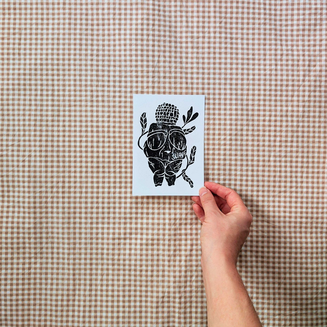 La linogravure, ou le travail de gravure sur linoleum, consiste à la création d'une plaque imprimable de manière artisanale, feuilles après feuilles, dans laquelle les vides du motif illustré viennent révéler le résultat final. Une encre noire, épaisse et pâteuse, spécialement utilisé dans ce cadre, se pose sur les parties en relief non retirées. Après pression du papier 250g sur la plaque, l'empreinte de l'encre se transfert sur ce dernier.