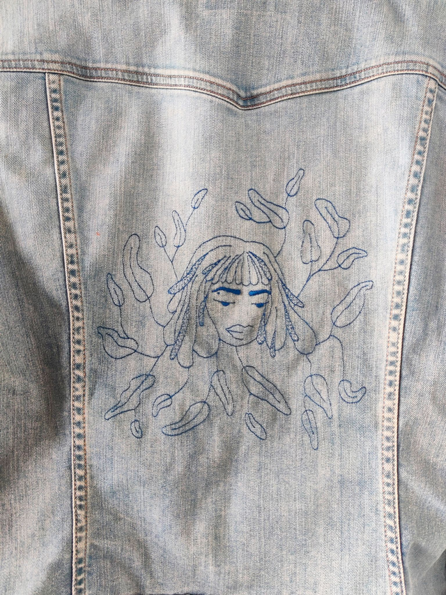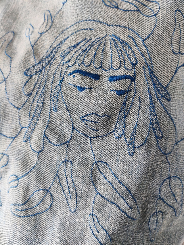 Article de seconde main valorisé par une broderie fait à la main "Visage de louve"